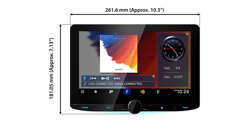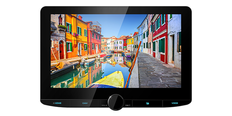 La pantalla de inicio de 10.1 "se compone de un widget de conducción y un widget de control de fuente superpuesto en el fondo. Puede mover el widget de conducción de un lado a otro o ampliar el widget de control de fuente para optimizar la pantalla para su operación intuitiva. El widget permite la selección de una configuración de reloj, brújula o ecualizador, etc., mientras que el fondo permite la selección de la carátula del álbum, visualizador de audio o foto.